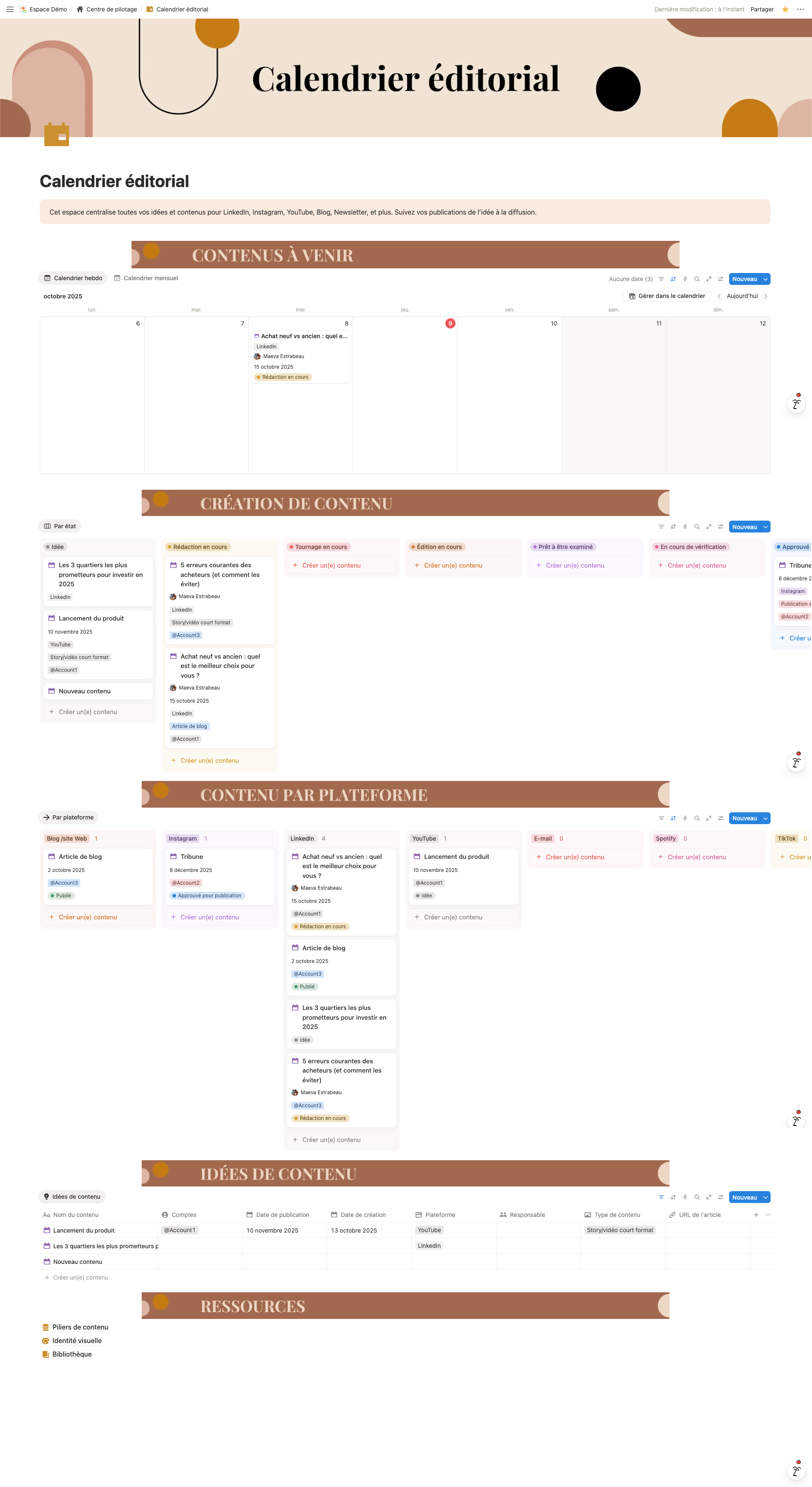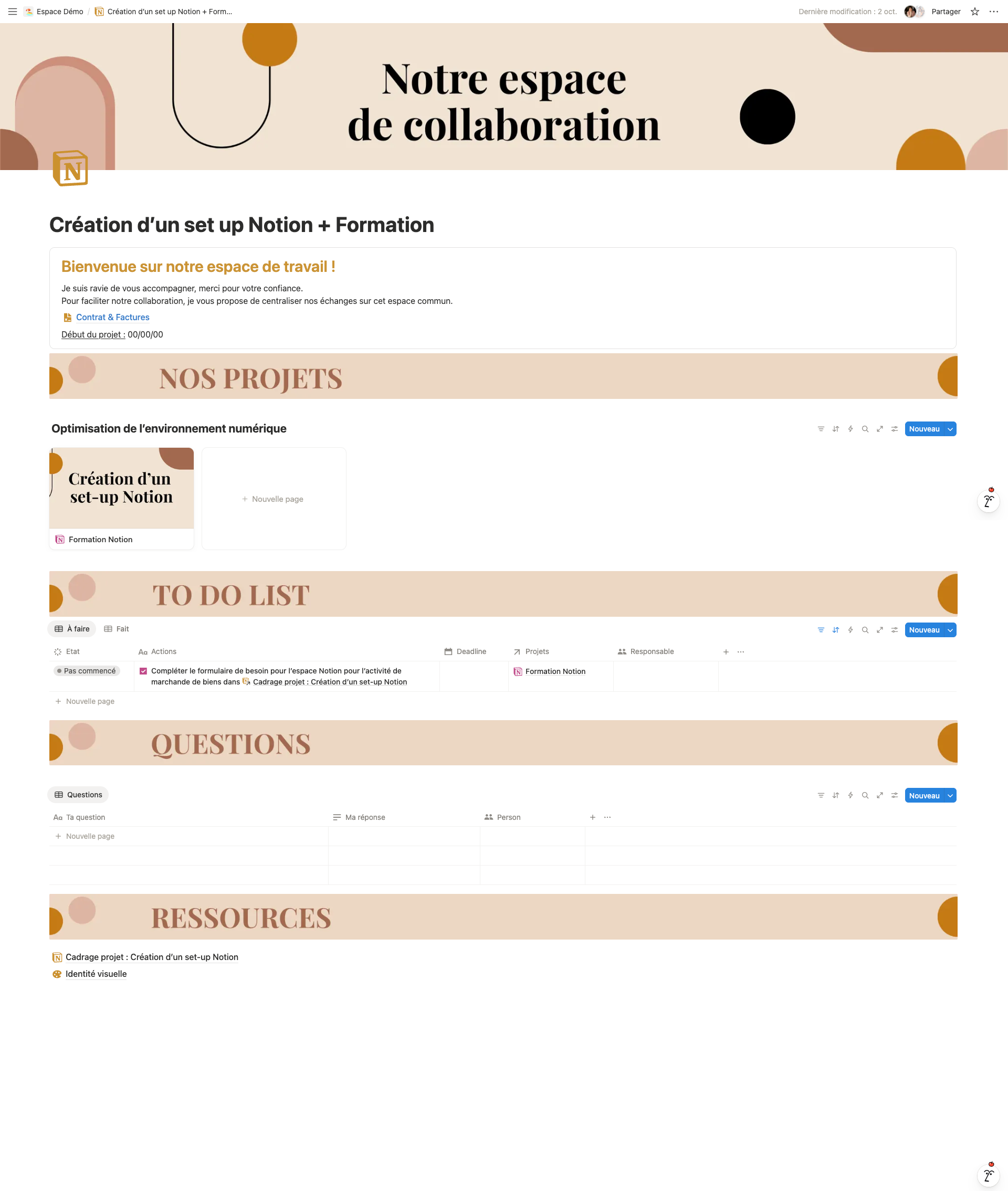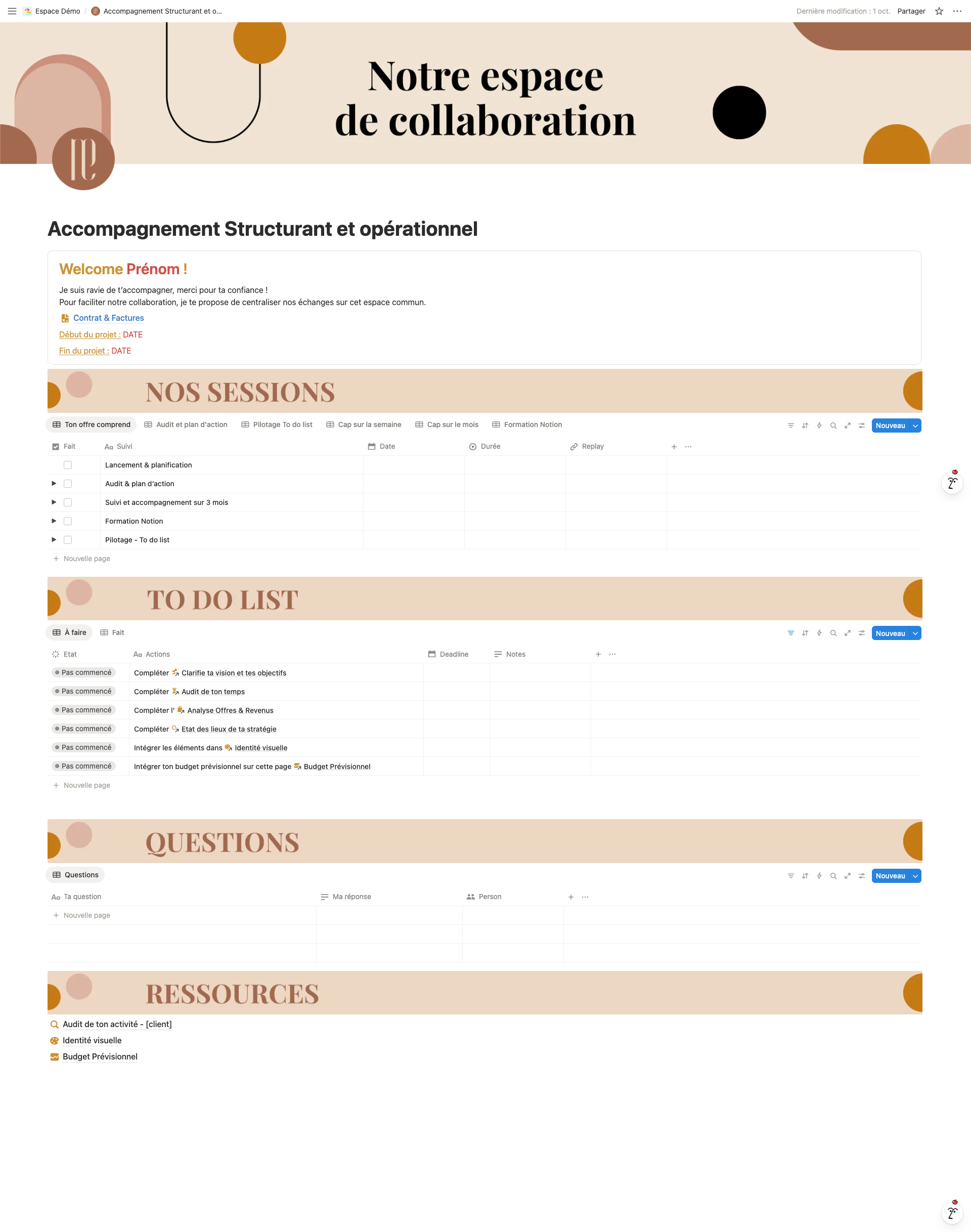 Un espace Notion 100 % personnalisé, conçu pour vous aider à organiser, centraliser et piloter votre activité plus facilement.